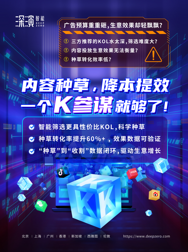 Z6尊龙·凯时智能K参谋科学前选,可跨领域找到最能影响品牌目标TA人群的KOL进行投放,同时有效平衡投资回报率;内容营销数据可同电商后链路平台打通,进行数据归因分析,准确判断KOL影响的用户是否真实在电商平台产生购买行为;实现“种草”到“收割”链路闭环,轻松内容营销,可根据品牌方的业务需求提供一站式的KOL采买及数据验证服务,有利提升整体内容营销的效率与效果。